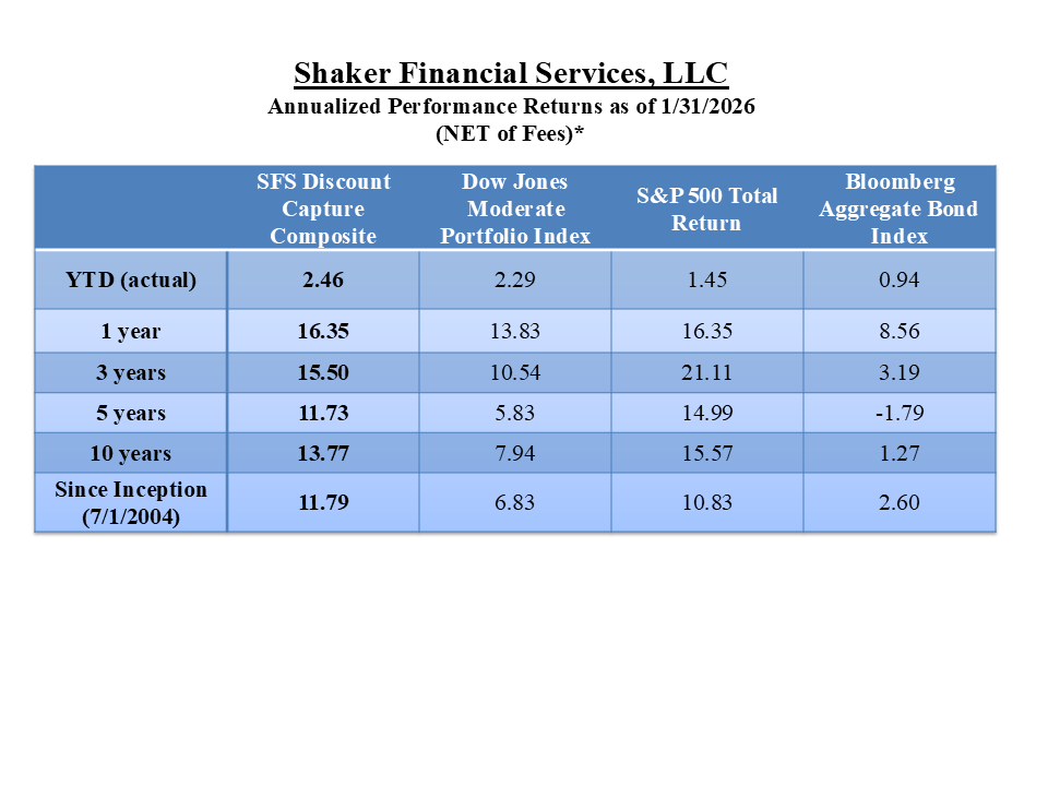Shaker Financial Services, LLC claims compliance with the Global Investment Performance Standards (GIPS®) and has prepared and presented this report in compliance with the GIPS standards. Shaker Financial Services, LLC has been independently verified. The SFS Discount Capture Composite has been examined for the periods June 30, 2004 through December 31, 2024.