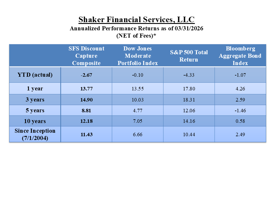 Shaker Financial Services, LLC claims compliance with the Global Investment Performance Standards (GIPS®) and has prepared and presented this report in compliance with the GIPS standards. Shaker Financial Services, LLC has been independently verified. The SFS Discount Capture Composite has been examined for the periods June 30, 2004 through December 31, 2025.