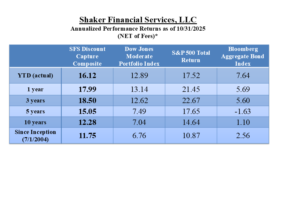 Shaker Financial Services, LLC claims compliance with the Global Investment Performance Standards (GIPS®) and has prepared and presented this report in compliance with the GIPS standards. Shaker Financial Services, LLC has been independently verified. The SFS Discount Capture Composite has been examined for the periods June 30, 2004 through December 31, 2022.