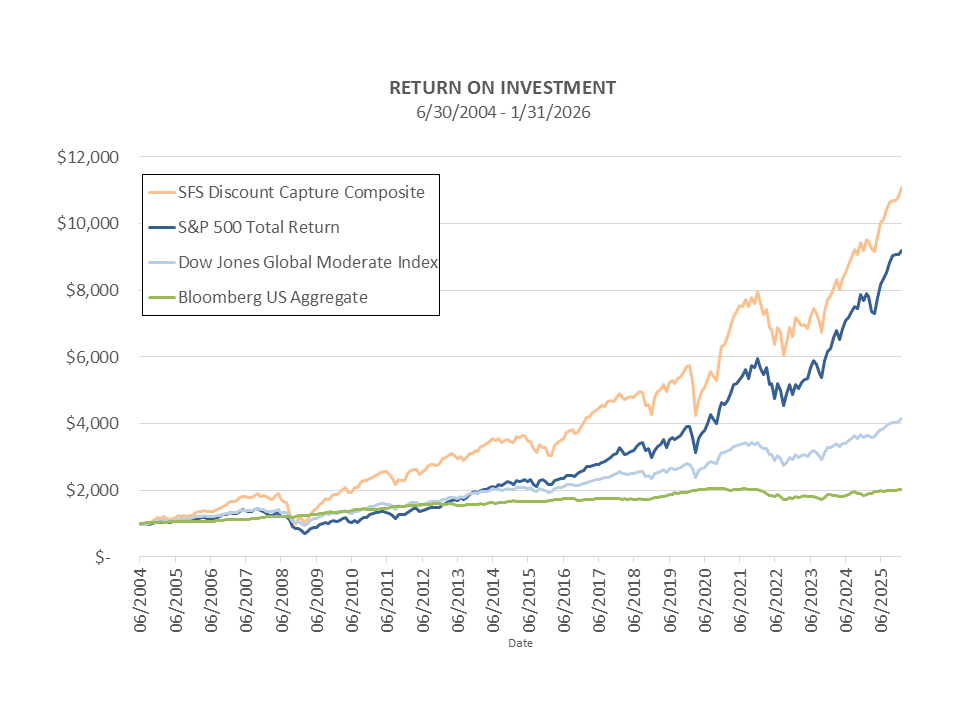 As shown in the chart above, a $1,000 investment subject to the returns of the SFS Discount Capture Composite would have been worth $11,075 (after management fees and other expenses) on January 31, 2026, as opposed to the $4,162 returned by a moderately allocated investment with the same performance as the Dow Jones Moderate Portfolio Risk Index, the $9,203 returned by the S&P 500 Total Return with dividends reinvested, and the $2,029 returned by a bonds based investment with the same performance of the Bloomberg Aggregate Bond Index.