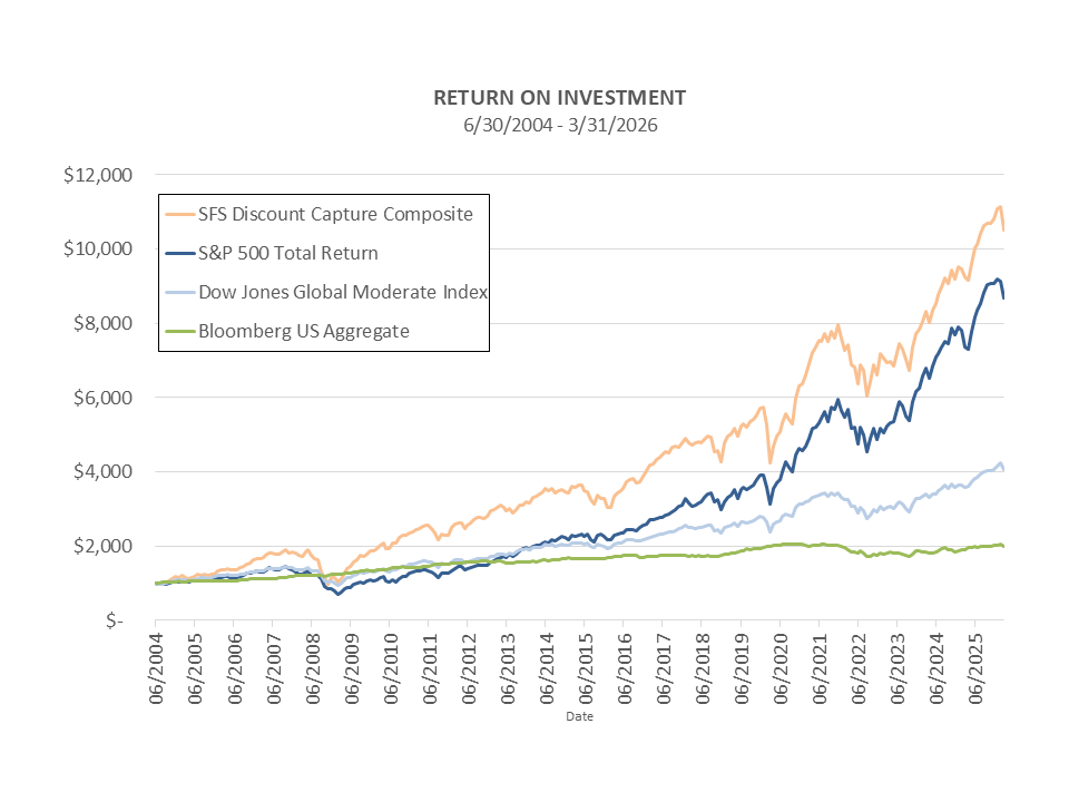 As shown in the chart above, a $1,000 investment subject to the returns of the SFS Discount Capture Composite would have been worth $10,521 (after management fees and other expenses) on March 31, 2026, as opposed to the $4,065 returned by a moderately allocated investment with the same performance as the Dow Jones Moderate Portfolio Risk Index, the $8,678 returned by the S&P 500 Total Return with dividends reinvested, and the $1,988 returned by a bonds based investment with the same performance of the Bloomberg Aggregate Bond Index.