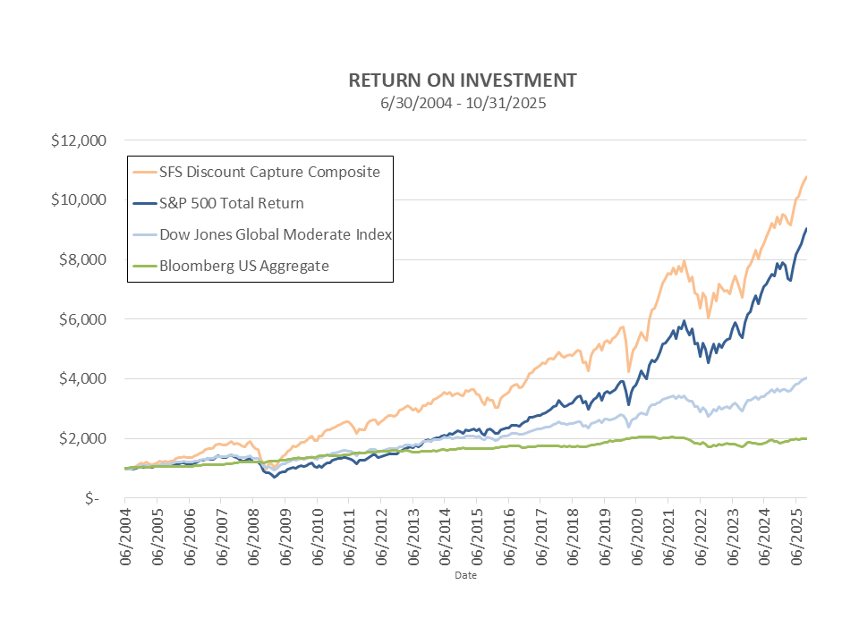 As shown in the chart above, a $1,000 investment subject to the returns of the SFS Discount Capture Composite would have been worth $10,692 (after management fees and other expenses) on October 31, 2025, as opposed to the $4,035 returned by a moderately allocated investment with the same performance as the Dow Jones Moderate Portfolio Risk Index, the $9,043 returned by the S&P 500 Total Return with dividends reinvested, and the $2,000 returned by a bonds based investment with the same performance of the Bloomberg Aggregate Bond Index.